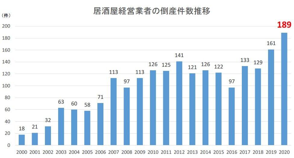 帝国データバンクでは、居酒屋経営業者の倒産動向について集計・分析し、その結果を1月7日に発表した。