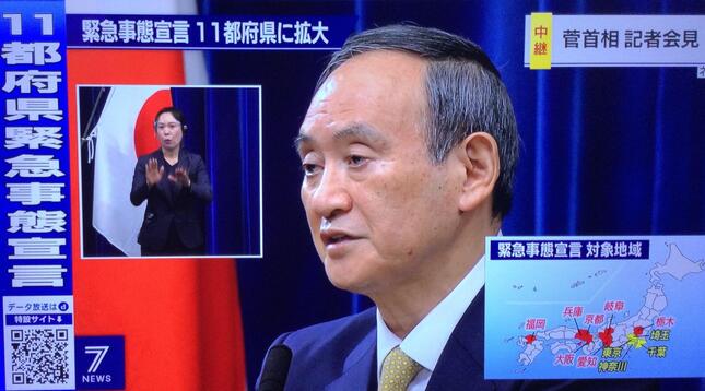菅義偉首相は2021年1月13日、新型コロナウイルス感染拡大に伴う緊急事態宣言を新たに大阪、京都、兵庫、愛知、岐阜、福岡、栃木の7府県に発令した。