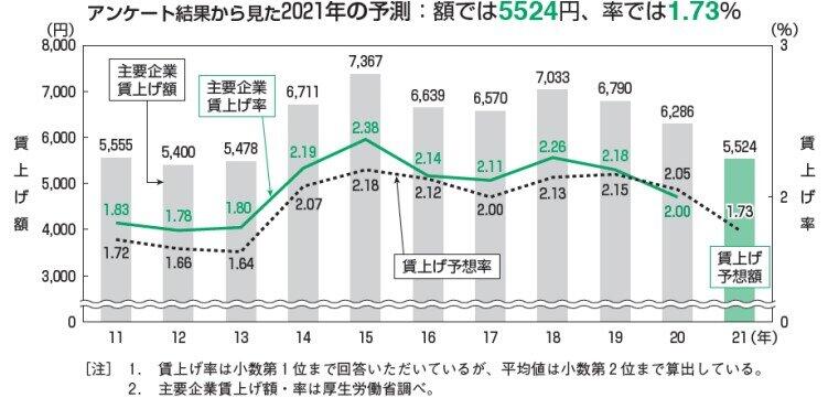 2021年の賃上げ見通しは、全回答者の平均で5524円、賃上げ率で1.73%だった。厚生労働省の調査における主要企業の20年の賃上げ実績(6286円、2.00%)から、762円、0.27 ポイント減少した=下図参照。