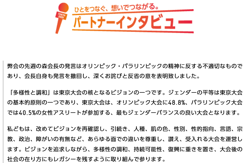 「当社としては、これまでもジェンダーフリーに向けたさまざまな施策に取り組んできており、東京2020 大会については、オリンピック・パラリンピックの精神に則って開催されると認識しています。(森会長がトップに残っていることについて)特にお伝えすることはございません。引き続きパートナーとして、東京2020大会の成功へ貢献したいと考えております」