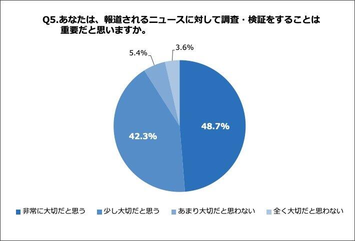 また、「報道されるニュースに対して調査・検証をすることは重要だと思うか」という問いには、「非常に大切だと思う」(48.7%)、「少し大切だと思う」(42.3%)を合わせて9割以上を占めた。「あまり大切だと思わない」(5.4%)、「まったく大切だとは思わない」(3.6%)などと大差がみられた=下の円グラフ参照。