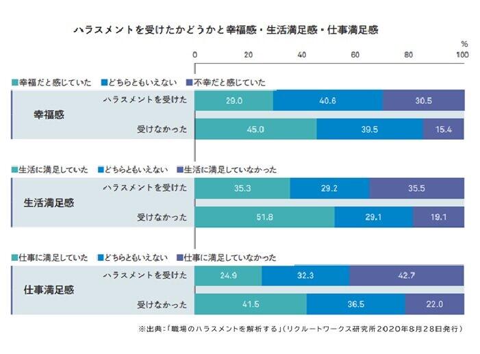 また、リクルートワークス研究所の調査によると、職場でハラスメントを受けた人は、受けなかった人に比べて、幸福感、生活満足感、仕事満足感のいずれにおいても低い傾向が顕著です=下図参照。想像に難くない結果ですが、職場のハラスメントと働く人の幸せや働きがいとは負の相関にあるのです。