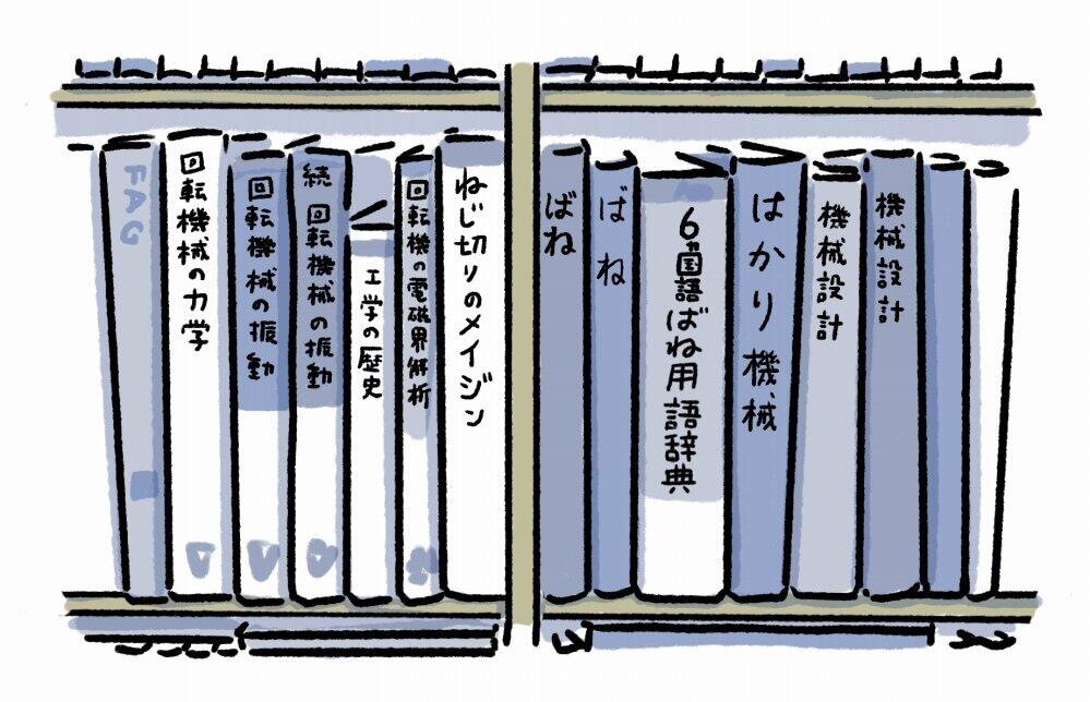 書棚には身近に感じにくい、難しげな文字が並ぶが、たまに「ねじ」や「石ころ」など身近に感じる言葉を見つけて思わず手にとる。自分には想像もつかない分野の研究が、この世にはあふれているんだなぁ、とワクワクする気持ちだ。