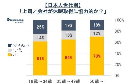 有給休暇をめぐっては2019年4月から順次施行された働き方改革関連法で取得が「義務化」されるなど、企業では休暇が取りやすくなるよう環境づくりが進められている。調査では、継続して「上司・会社は休暇取得に協力的か?」との問いが、2020年は「はい」と答得た人が65%で、前年(53%)より12ポイントアップした。