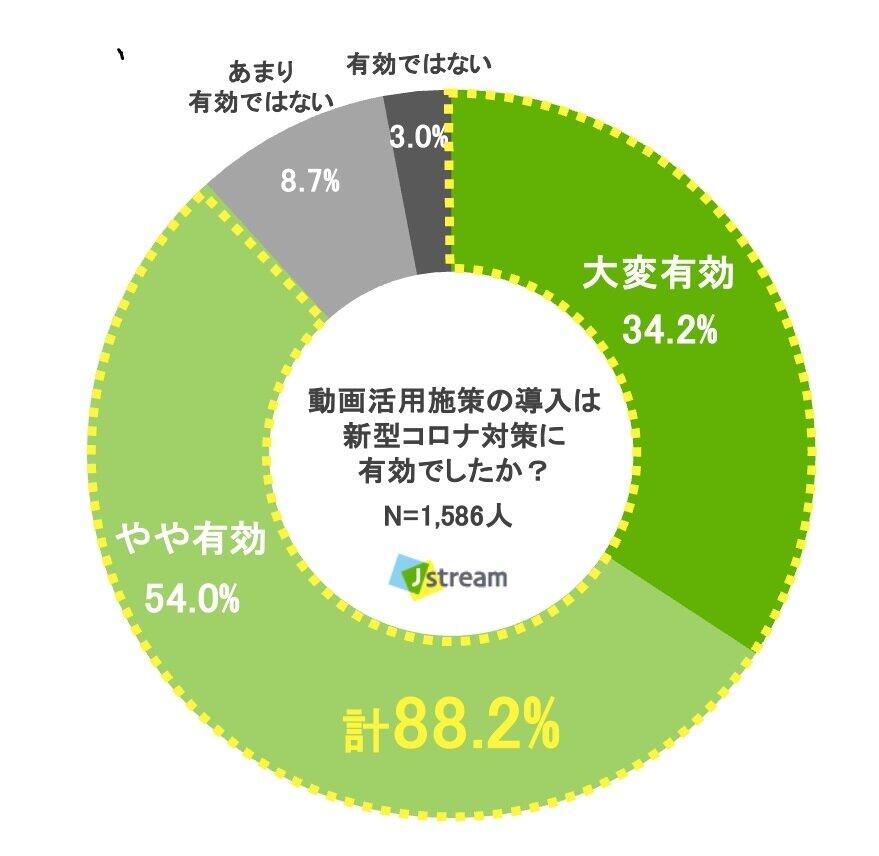 同様に、動画活用策がコロナ対策に有効だったかどうか聞いたところ、「大変有効」(34.2%)と「やや有効」(54%)を合わせた88.2%が効果を感じていると回答した=下の円グラフ参照。