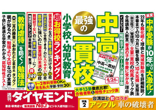 「週刊ダイヤモンド」(2021年4月24日号)の第1特集は、「最強の中高一貫校」。小中学生の親にとって関心あるテーマを取り上げている。コロナ禍での変動を、エリア別、公立中高一貫校、大学付属校などカテゴリー別にレポートしている。