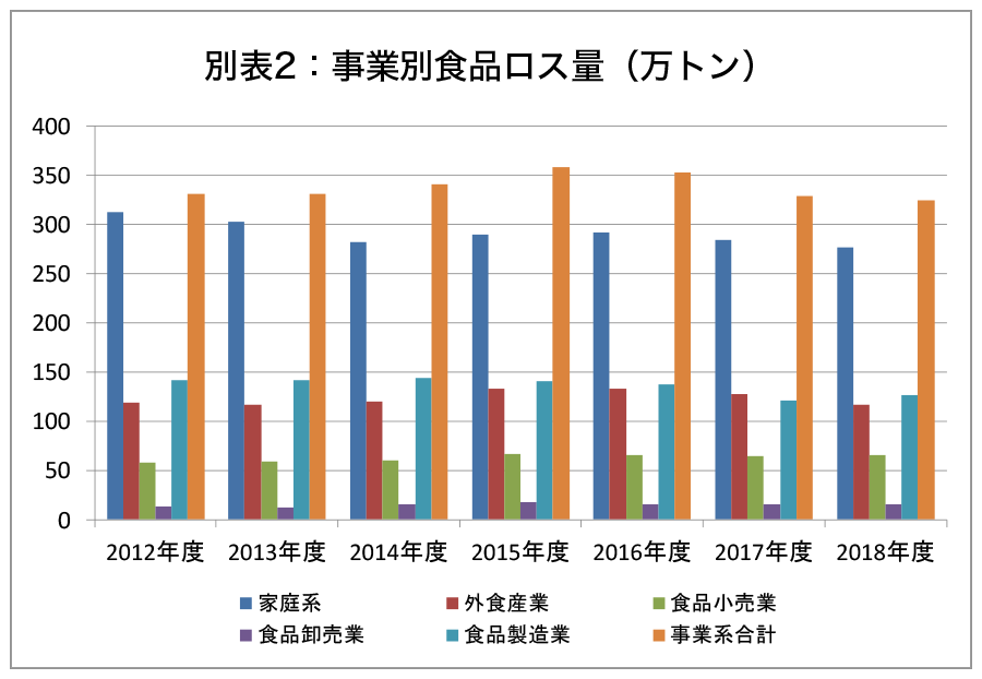 一方、家庭などによる食品ロス量も、2012年度の312万トンから18年度には276万トンと36万トン減少し、年々減少してはいるものの、引き続き高い水準で食品ロスが発生している。
