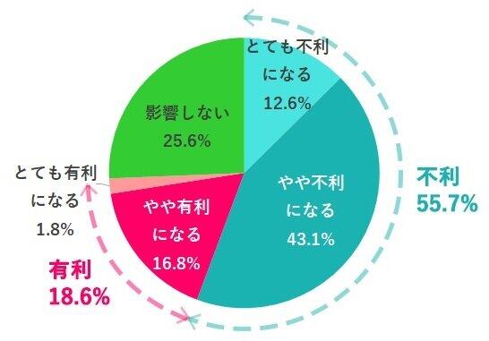 「有利になる」と考えている人は18.6%(「やや有利になる」16.8%と「とても有利になる」1.8%の合計)で、「不利になる」派はその約3倍だ。「影響しない」は25.6%だった=下の円グラフ参照。