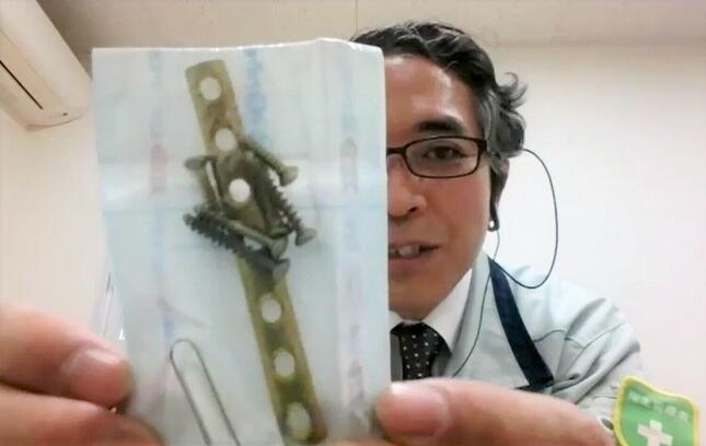 下の写真は、日東精工(京都府綾部市)研究開発部の上野美光さんの足に入っていたボーンプレートとねじだ。プレートはちょっとの力では曲がらないし、折れそうにない。ねじも2センチメートルほどの長さがある。これが体内に埋め込まれていた。もう7年前のことだ。