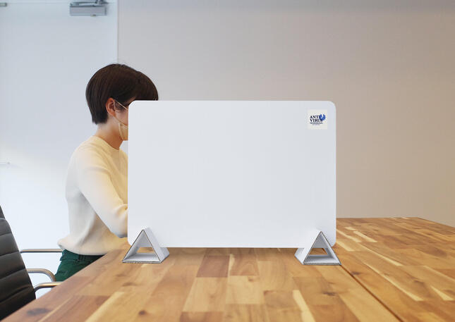商品ラインアップは、机やテーブルに置く間仕切り「抗ウイルス〈置くだけ〉卓上ボード」、階段の手すりやドアノブなどに貼る「接触感染対策テープ」、「接触感染対策シート」、床などに敷く「抗ウイルス〈置くだけ〉マット」、はずしたマスクをしまう「抗ウイルス〈はさむだけ〉マスク」の5種類。いずれも漆喰塗料をコーティングした紙や布を使った商品で、付着したウイルスを短時間で死滅させるため、飲食店などで使われているアクリル板に必要なアルコール消毒は不要だ。