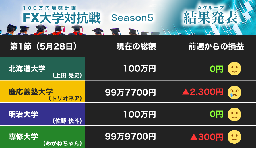 FX大学対抗戦での目標は「FX・海外事情についての知識を深める」ことと「100万円を倍にする!」です。この機会を通じて、自分になんらかの成長を感じられたらなぁと考えています。対戦者のみなさま、どうぞよろしくお願いします。