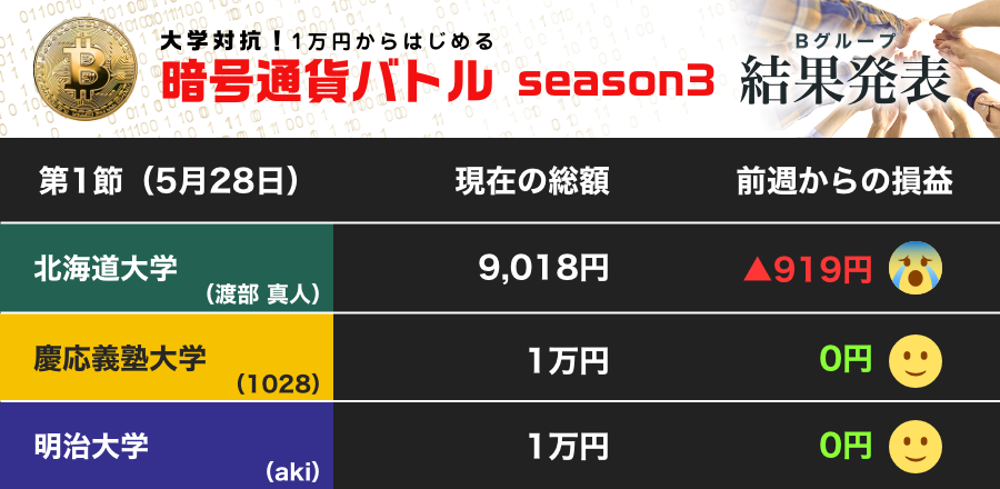 「大学対抗 1万円からはじめる暗号通貨バトル」に5大学6人が参戦する。AグループとBグループに分かれた6人の学生トレーダーが6か月間の勝負に挑む。折しも、暗号通貨の代表格、ビットコイン相場は大きな下落を経験。波乱含みのスタートだ。