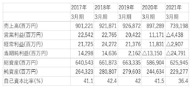 まず、2020年、21年は大幅な赤字となっている。コロナ禍での緊急事態宣言による休業要請やインバウンド消費の減少が主な原因だろう。自己資本比率も40%を割り、良い経営状態であるとは言えない。ROA(総資産利益率) はマイナス4.09%、ROE(自己資本利益率)もマイナス10.52%と共に大きなマイナスだ。