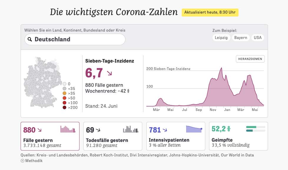 新型コロナウイルスの感染急拡大の「第3波」を受け、4月下旬に全国一律の「緊急ブレーキ(外出制限や経済活動休止などを規制)」を適用したドイツ。 参考リンク:「ドイツはついに『緊急ブレーキ』導入! コロナ検査日常化で「第3波」封じ込めなるか?」(神木桃子)J-CASTニュース 会社ウォッチ2021年5月3日付緊急ブレーキの発動は「7日間指数(過去7日間の人口10万人あたりの新規感染者数)」が100人以上と定められていますが、デュッセルドルフ市の7日間指数は当時150人以上でした。そのため、食料品店やドラッグストアなど生活必需品の販売店以外の各種小売業は店舗を閉鎖していたのです。 そこからしっかり数字が下がり、約3週間後の5月中旬には規制緩和の第1段階の条件だった7日間指数100人を下回り、さらに2週間後には第2段階の50人以下となりました。6月25日現在のドイツ国内の7日間指数は6.7にまで下がり、27つの自治体(最初に達成したのはゴスラーとフリースラント)で7日間指数が0人と発表されました=下図参照。