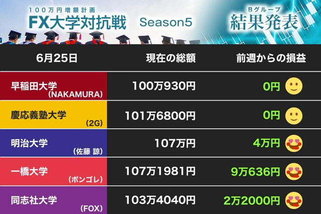 明治大学の佐藤諒さんは、前週から持ち越していたオーストラリアドル円とユーロ円で利益を確保。一橋大学を追う。同志社大学のFOXさんも着実に利益を積み上げ、上位にプレッシャーをかける。