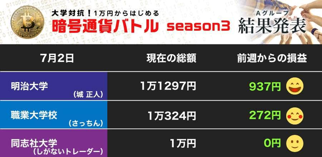 そうしたなか、手堅く利益を確保したのが職業能力開発総合大学校のさっちん。「私としては予想しやすくて取引しやすい状況にあります」と話す。レンジ相場で、「大きい利益にはなりませんが、確実な取引を目指していきたい」と、まずは先週の「負け」を取り戻す。