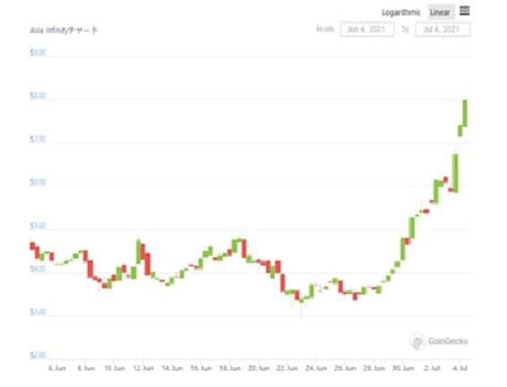 そこで、今ひそかに盛り上がっているNFT関連銘柄をご紹介します。その名もAXS(Axie Infinity)です。Axieはここ1週間で2倍をこえる急騰を見せています。最近軟調に推移している暗号通貨市場全体の値動きと比較するとかなり強気な値動きをしているといえます。