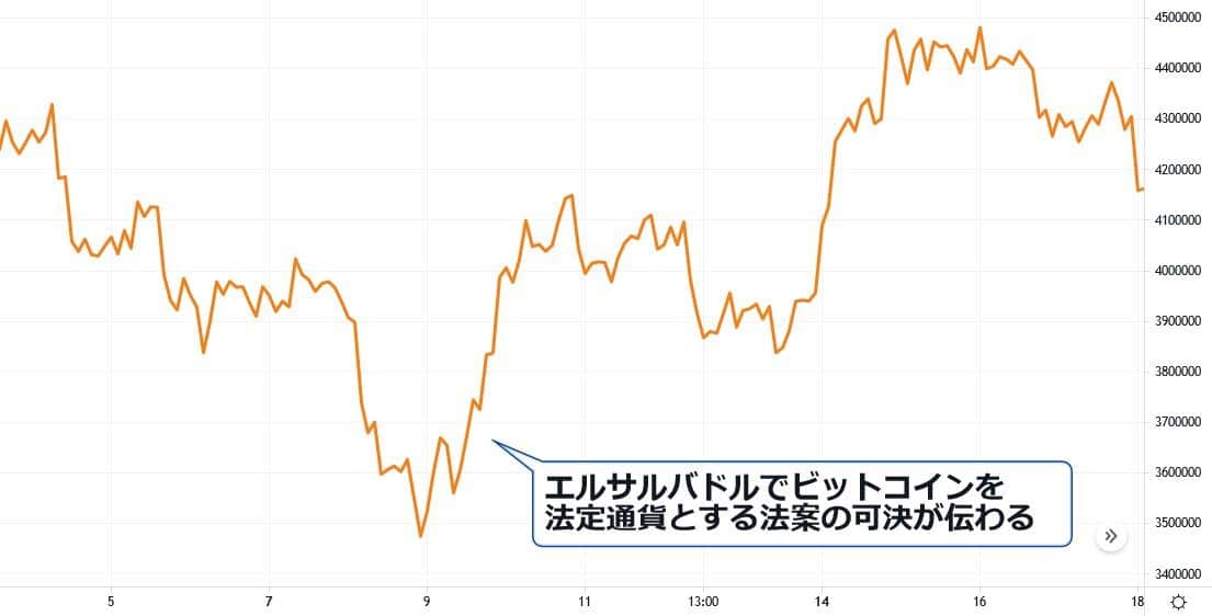6月9日にエルサルバドルの議会で法案が可決(賛成62人、反対19人、棄権3人)されると、ビットコインは大幅に上昇しました。仮想通貨市場に全体も大きく盛り上がり、仮想通貨市場の時価総額は1日で10兆円ほど増加しました。
