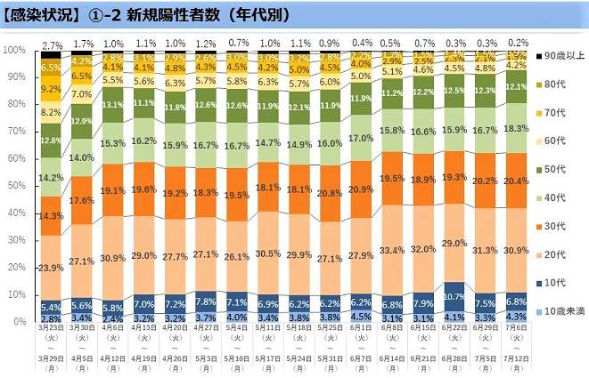 東京都の公表データによると、7月に入り、重症者では50代が60代を上回り、全体の4割近くに達した。入院者数の世代別割合をみても、50代が6月以降、最多の状況が続く。30代、40代の入院者数の割合も増えて、50代以下で全体の約7割を占めるようになった。