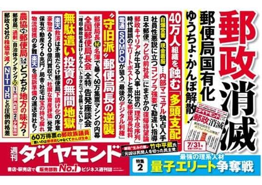 7月26日発売の「週刊ダイヤモンド」(2021年7月31日号)の特集は、「郵政消滅」。「郵便局国有化、ゆうちょ・かんぽ解散」というショッキングなタイトルを掲げている。