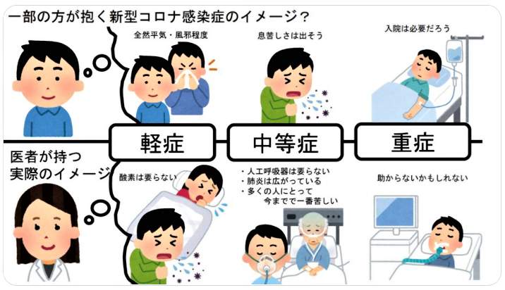(1)「軽症」では、一般人は「全然平気、風邪程度」と思う人が多いようだが、医師が持つ実際のイメージは「酸素(吸入器)は要らない」ということにすぎない。