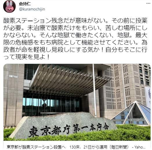 「酸素ステーション残念だが意味がない。その前に投薬が必要。未治療で酸素だけもらい、苦しむ場所にしかならない。そんな地獄で働きたくない、地獄。最大限の危機感をもち病院として機能させてください。為政者が命を軽視して見殺しにする気か! 自分もそこに行って現実を見よ!」