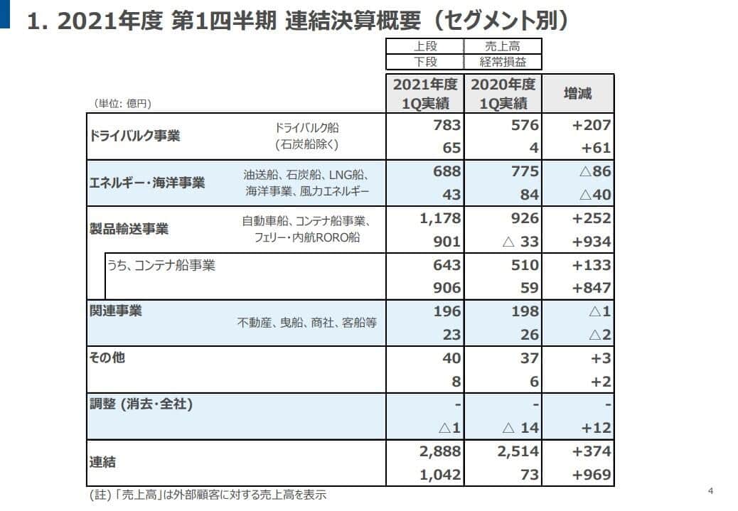 図1:商船三井2021年度1Qセグメント別連結決算概要(出典:商船三井2022年3月期/第1四半期 決算説明資料/2021年7月30日)