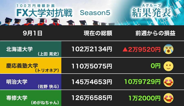 専修大学のめがねちゃんも、プラスは確保しているものの、スッキリしない。自身の苦手な相場で「勝つ手法」を探しているようだ。慶応義塾大学のトリオネアさんは、多忙だったため、取引を見送った。
