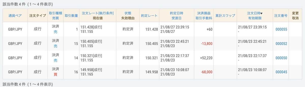 マイナス6万8000となった取引が、かなり痛手となりました。これは先週(8月16日週)から保有していた英ポンドの分で、それまでのチャートの形から自分なりに分析したところ、下落トレンドを作っているだろうと思い、ショート(売り)していました。