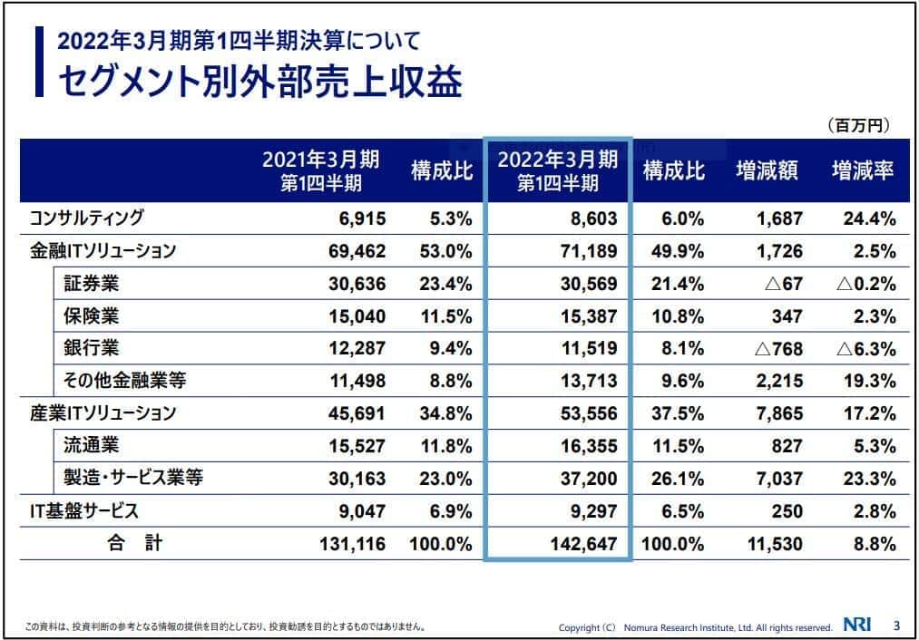 野村総合研究所の決算説明資料から、セグメント別外部売り上げ収益をみる=上表参照=と、金融ITソリューションに大きな強みを持っていることがわかる。さらに細かく見てみると証券業が大きなウェイトを占め、これは同社が野村証券から独立した影響もあると考えられる。