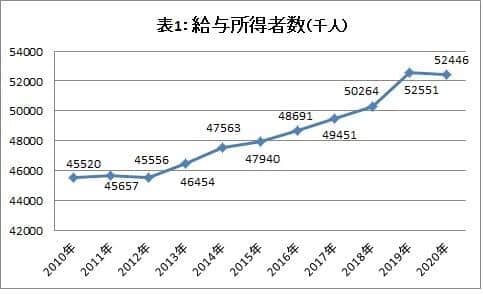 2020年の1年を通じて勤務した給与所得者数は、前年比0.2%・10万人減少し、5245 万人となった。男性は同1.5%・44万人増の 3077万人だったが、女性は同2.5%・55万人減の2168 万人と、雇用の悪化は女性に大きく表れた=表1参照。