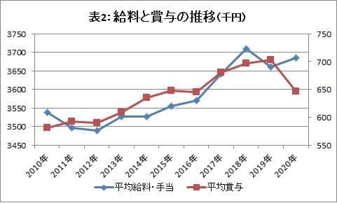 内訳をみると、平均給料・手当は0.7%増の369万円(男性は同0.1%増の449万円、女性は同0.4%増254万円)とともに増加したものの、平均賞与は同8.1%減の65万円(男性は同8.6%減の83万円、女性は同8.9%減の39万円)と大幅に減少しており、賞与の減少が平均給与の減少に影響している=表2参照。