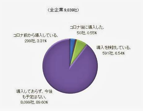全体の10.4%の940社が「すでに導入している」(3.8%)、「導入を検討している」(6.5%)と回答した。一方、約9割(89.6%)の8099社が「導入しておらず、今後も検討予定はない」と回答した。導入に積極的な企業が約1割いるわけだ=下の円グラフ参照。