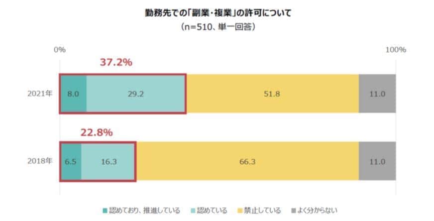これは2018年の22.8%よりも14.4ポイント高い数値で、企業の「副業・複業」に対する許容度が3年間で高まったことがわかった。その一方で、「禁止している」と答えた企業は51.8%で、依然として半数以上が禁止している=下の図1参照。