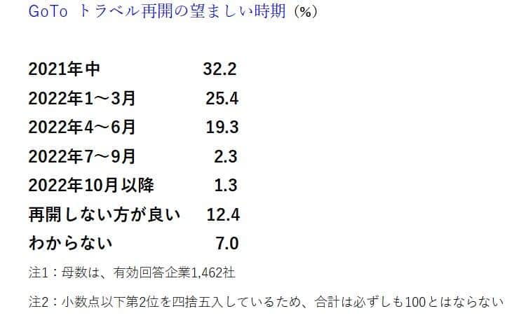 「2021年中」と回答した企業は32.2%で、約3社に1社は早急にGoToトラベルの再開を望んでいる様子がうかがえた。一方で、企業の12.4%は「再開しないほうが良い」と考えており、一部で慎重な姿勢もみられる。