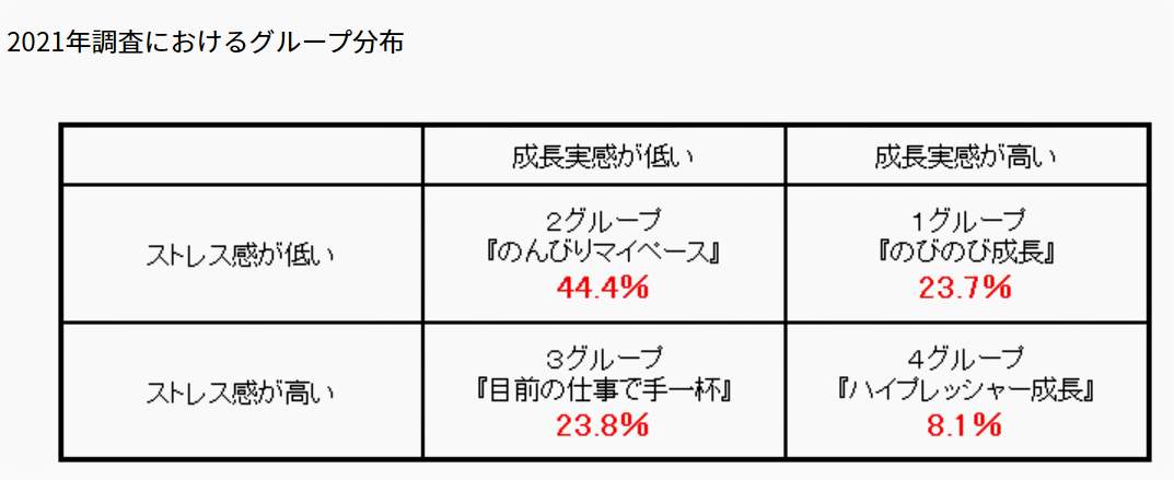 (2)一方、「職場でストレスを感じているかどうか」と「成長している実感があるかどうか」を調べたデータでは、以下の4つのグループにわけて分析した。