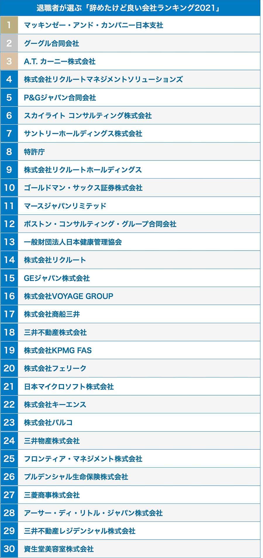 その結果、トップ3はすべて、また上位10社を見ても半数の5社に外資系企業が並んだ=上の表参照。1位は米国に本社を置く世界的大手コンサルティングのマッキンゼー・アンド・カンパニー日本支社。2位は米情報通信の超大手GAFAの一角グーグル。3位は米マッキンゼーのシカゴオフィスから独立、世界的コンサルティングに成長したA.T.カーニー。4位は日本のリクルートグループで企業内研修・人事コンサルを手掛けるリクルートマネジメントソリューションズ。5位は米の世界最大一般消費財メーカーのP&Gジャパン。
