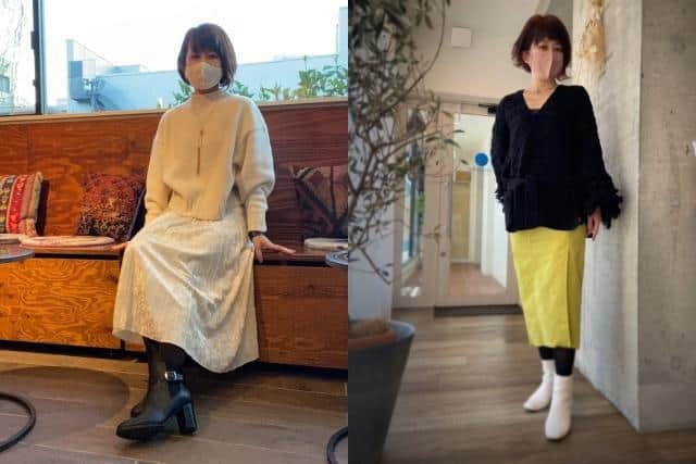 冬は暗い色が多くなりがちですが、売り場にはキレイな色のニットやスカートが置いてあります。意外と気づいてないだけ、ということも多いんです。暗い色と色物の相性は、とってもいいですよ。一気に華やかになります。