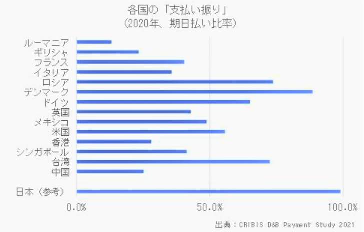 この調査には、日本は含まれていない。しかし、日本企業を同等の基準で分析すると、期日払い率は99%で、ほとんどが請求通りに入金される。世界最高の支払い振りのよさだ。東京商工リサーチの分析によると、これは「手形の厳格な期日決済を含め、長年培ってきた商慣習の結果とみられる」という。