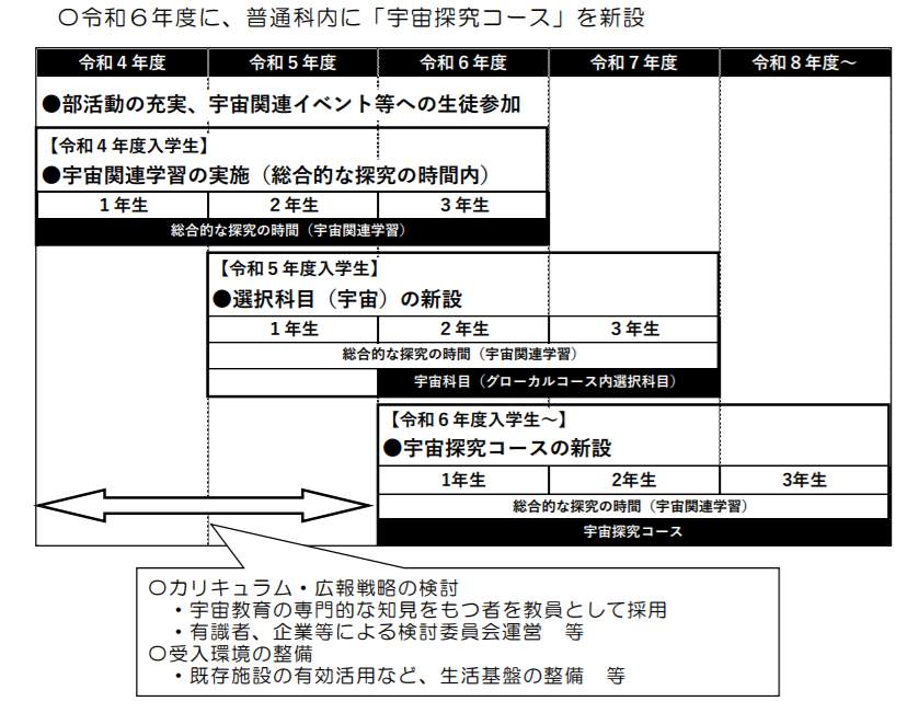 コースの新設に備え、2022年度入学生から「総合的な探究の時間内」に宇宙関連学習をするほか、宇宙関連イベントなどへの参加を進める。そして、2023年度入学生には選択科目として「宇宙」を新設する。