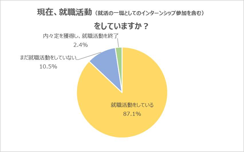 調査では、「現在、就職活動(就活の一環としてのインターンシップ参加を含む)をしているか」と聞いたところ、「内定(内々定)を獲得し、就活を終了」とした人は2.4%(前年同期1.7%)にとどまっている。