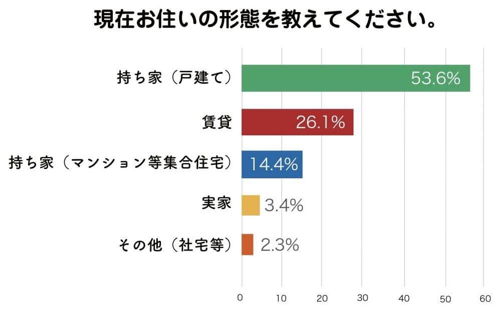 一方、「賃貸住宅」に住んでいる世帯も26.1%いた。「実家」(3.4%)や「社宅など」(2.3%)に住み、住居費にそれほど苦労しないですむ世帯は5.7%だけだった。