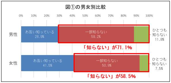 男女別でみると、男性のほうが、女性よりも「知らない」傾向にあることがわかる=図表2参照。