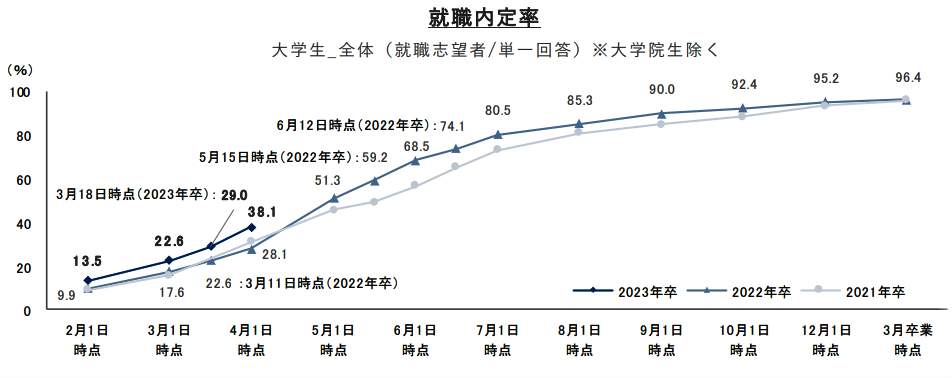 そんななか、リクルートの就職・採用関連の研究機関「就職みらい研究所」が2022年4月7日、2023年卒大学生・大学院生を対象にした就活状況を調べた「2022年4月1日時点 内定状況」を発表した。