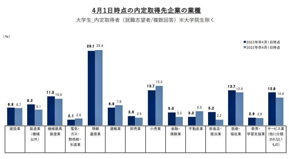 内定取得先の業種をみると、情報・通信業が29.4%と、ダントツに高いことが特徴だ=図表2参照。ITスキルを持つ人材は、世界的に奪い合いが熾烈(しれつ)だ。とくに、優秀な学生は早くから海外から誘いの手が伸びるため、IT系企業が積極的に「囲い込み」に動いているからだろうか、選考も早く進むようだ。続いて、小売業(15.3%)、医療福祉業(12.8%)、サービス業(10.8%)、機械器具製造業(10.4%)と続く。