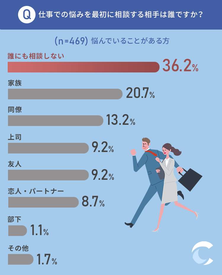 こうした仕事上の悩みは、できることなら誰かに相談して、解決への糸口を見つけてほしいものだ。今回の調査では、「仕事での悩みを最初に相談する相手は誰か?」について聞いた結果、