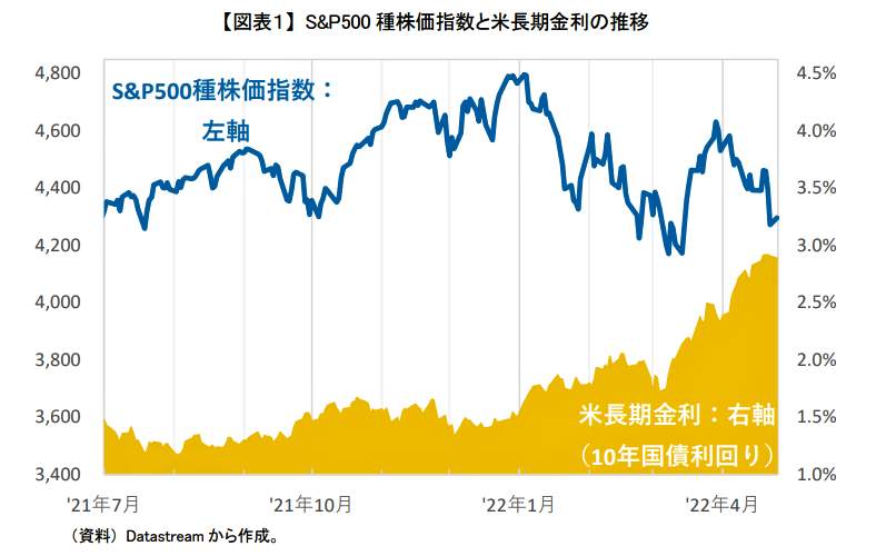 米国株式は3月15日、16日のFOMCを通過してから持ち直していたが、4月に入ってから再び下落してきている。図表1をみると、S&P500種株価指数(青線)は3月上旬に一時4200ポイントを下回っていたが、3月末には4600ポイント台まで戻した。その後は、FRBの金融政策に対する警戒感から下落。とくに、4月21日、22日と2日間で4%以上下落、再び4200ポイント台で推移している。