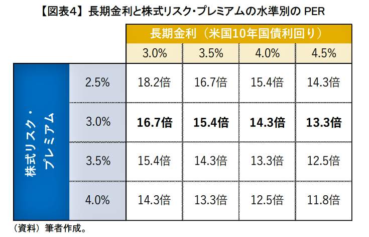 その理由として前山氏は、米国の長期金利と、株式リスク・プレミアムの水準別PERが、仮に長期金利が3.5%まで上昇すると、予想PERが15倍台まで低下することに注目した=図表2参照。