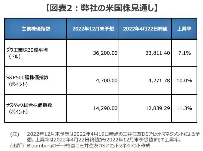 「一方、当面は急ピッチの利上げが行われたとしても、比較的早い段階でインフレのピークアウトが確認されれば、(2)のシナリオが実現する公算が大きくなります。この場合、その後の利上げペースは緩やかなものとなり、市場の過度な利上げの織り込みも後退すると思われます。(中略)米国では期待インフレ率の低下により10年国債利回りの上昇が一服、ドル高・円安の動きも一巡し、米国株は上昇基調回復が期待されます」