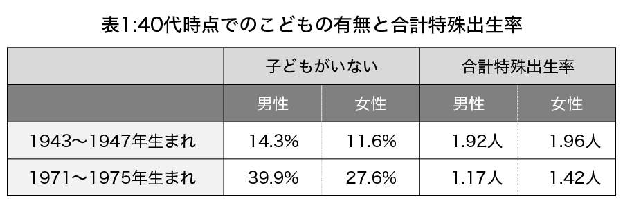 合計特殊出生率では、男性は1943~1948年生まれで1.92人だったのに対して、1971~1975年生まれでは1.17人に減少していた。一方の女性では1943~1948年生まれで1.96人から1971~1975年生まれでは1.42人に減少していた=表1。
